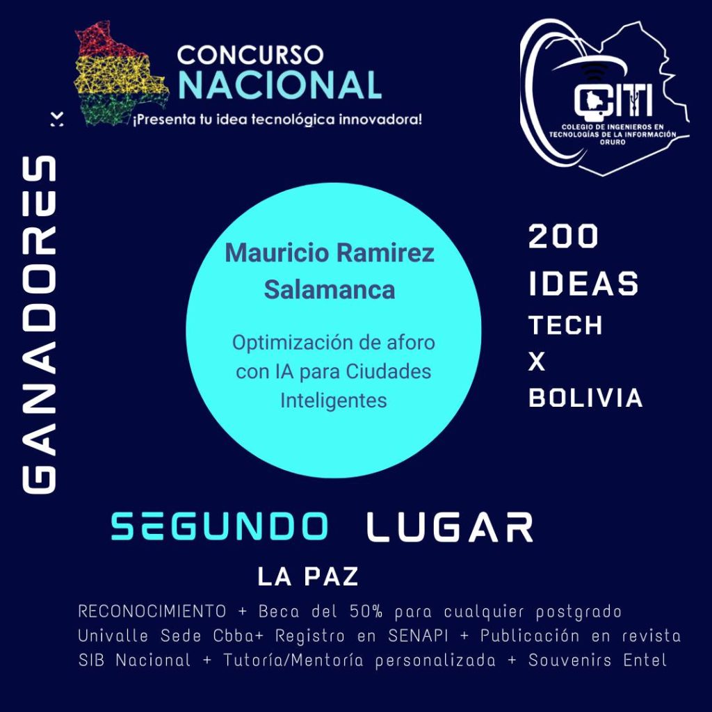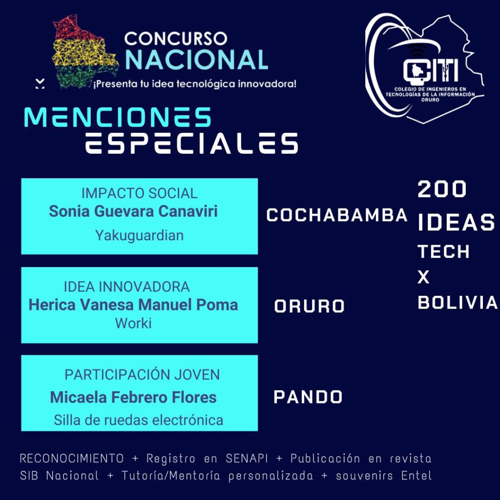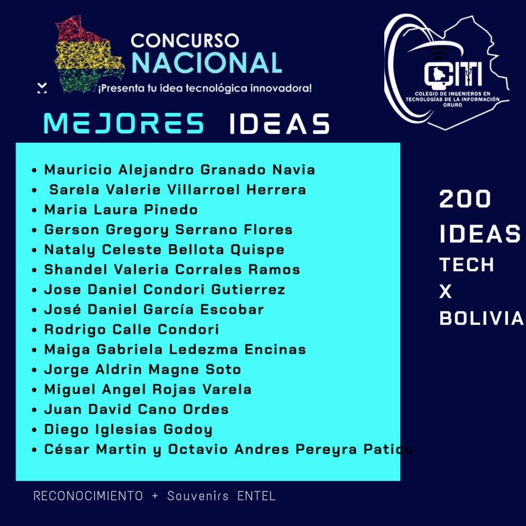El Colegio de Ingenieros en Tecnologías de la Información – Oruro, en coordinación con la Sociedad de Ingenieros de Bolivia, tiene el honor de presentar los resultados del Concurso Nacional “200 Ideas Tech por Bolivia”, una iniciativa que reunió el talento y la innovación de participantes de todo el país.