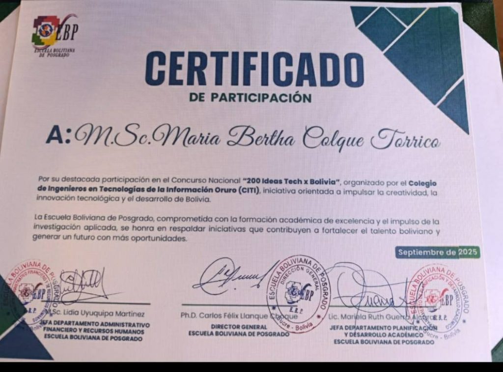 🎓 En el marco del concurso “200 Ideas Tech por Bolivia”, se hizo efectiva la entrega del primer premio, consistente en una beca del 50% para estudios doctorales, otorgada a nuestra afiliada M.Sc. Ing. María Colque, a quien felicitamos por su esfuerzo, dedicación y compromiso.